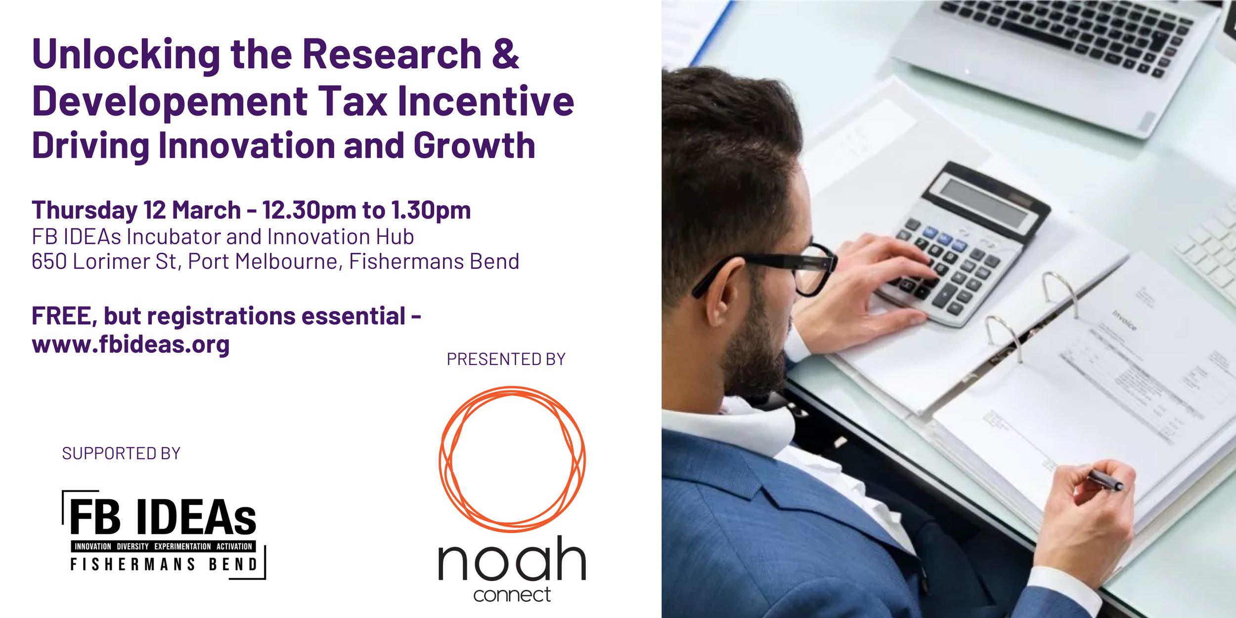 Join us for a FB IDEAs Lunch & Learn event with NOAH Connect. Director Maggie Ng will guide founders, innovators and business leaders through the essentials of the Research & Development Tax Incentive (RDTI) and how it can support innovation strategies.