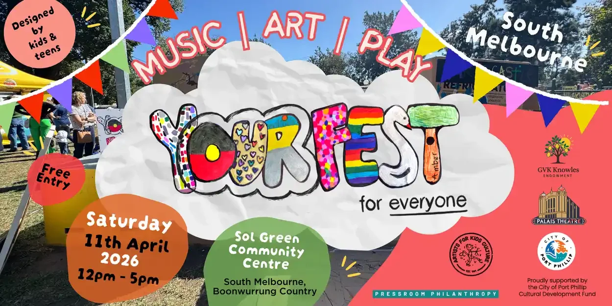 Hosted in South Melbourne on Boonwurrung Country, Y(Our) Fest is an inclusive free one-day festival designed by kids - for everyone! Curated by primary aged kids who have been part of the Artists for Kids Culture artsbus program at Park Towers Estate and across the City of Port Phillip. There's something for everyone at Y(Our) Fest!